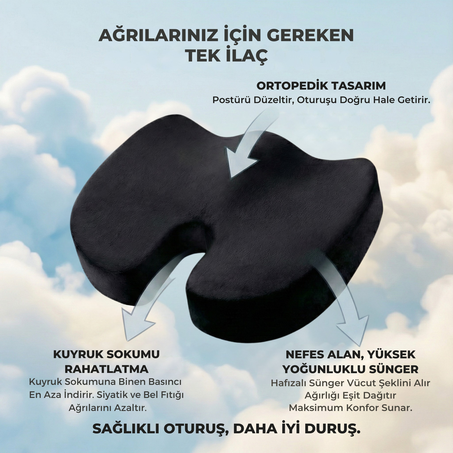 VisCloud ortopedik oturma minderi; çalışma sandalyesinden araç koltuğuna, evdeki kanepeden yemek masasına kadar oturduğun her yerde daha dengeli ve konforlu bir oturuş için tasarlandı.